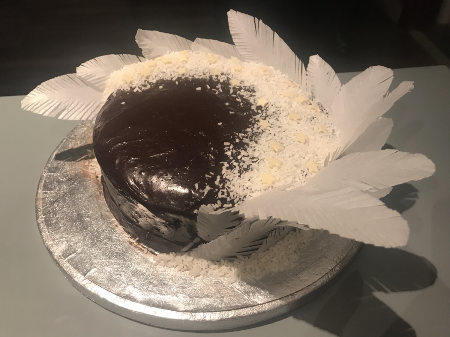 I added some wafer paper feathers, desiccated coconut and white chocolate stars to play along the light and dark theme of the cake, but you can have it just as simple as Nigella would and it would taste just as ‘heavenly’ as she described. ❤️❤️