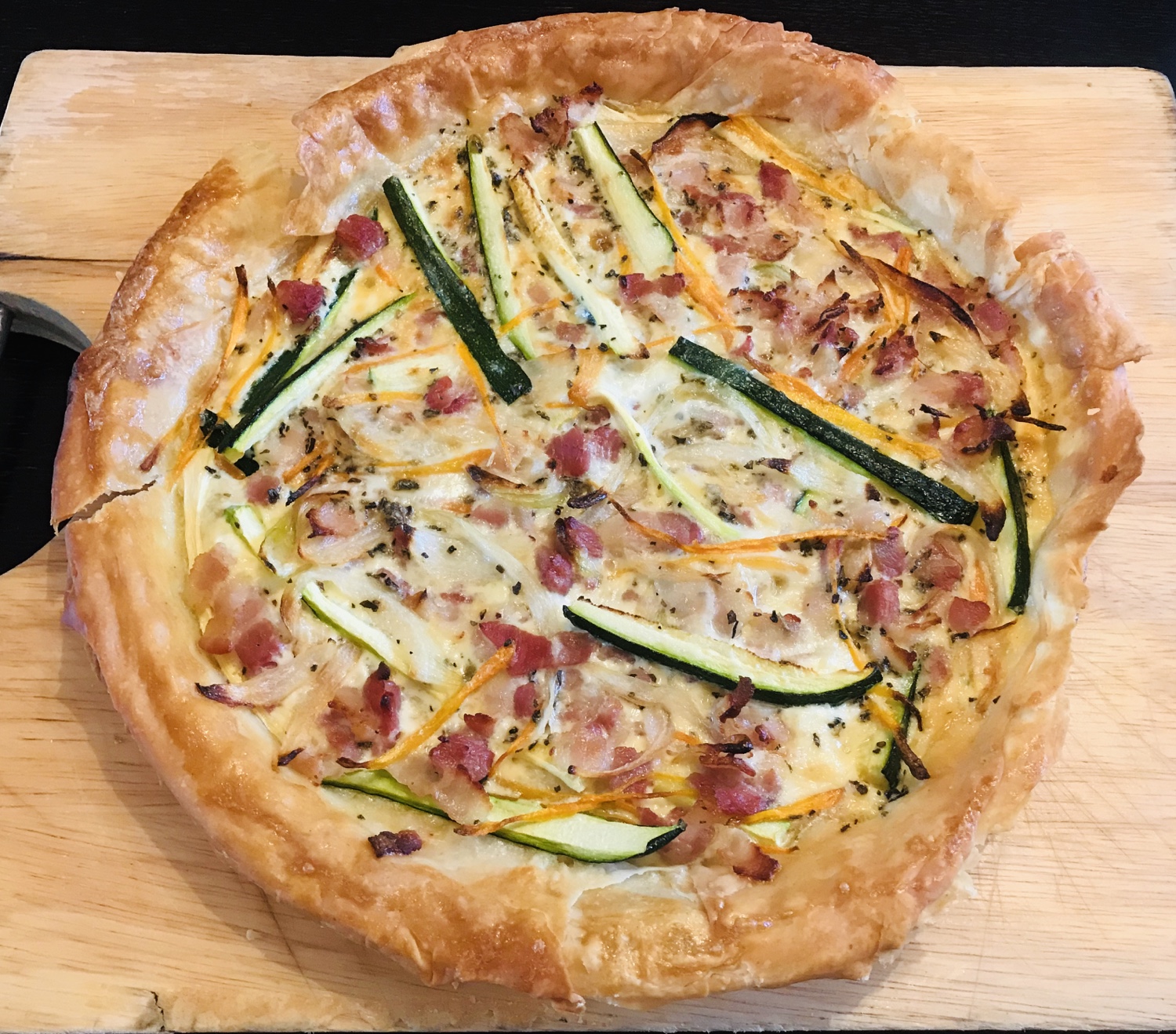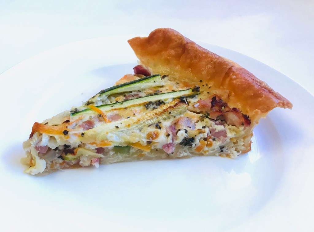 The weather is much cooler here in Edinburgh than in London. (That last week there before I hopped onto the train was getting unbearable! 🥵🔥🔥) As a result, I have been really enjoying my mum’s hearty home cooking. It was my turn to cook tonight, and I decided to make a filo quiche using the scraps left in my mum’s fridge (we had some already sliced carrots and onions from the previous nights, plus some unused bacons and courgettes). 😉
