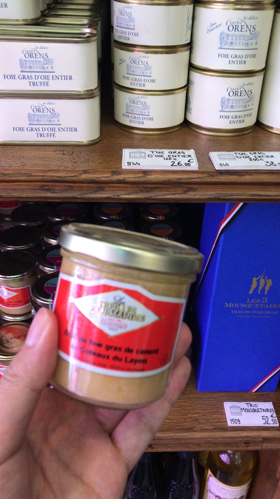 While most of the foie gras was in the region of around €20 to €40, this one I was holding only costed €8. When I asked for the reason, it turned out that this one was made from duck livers rather than those of geese, so it was less valuable. 😯